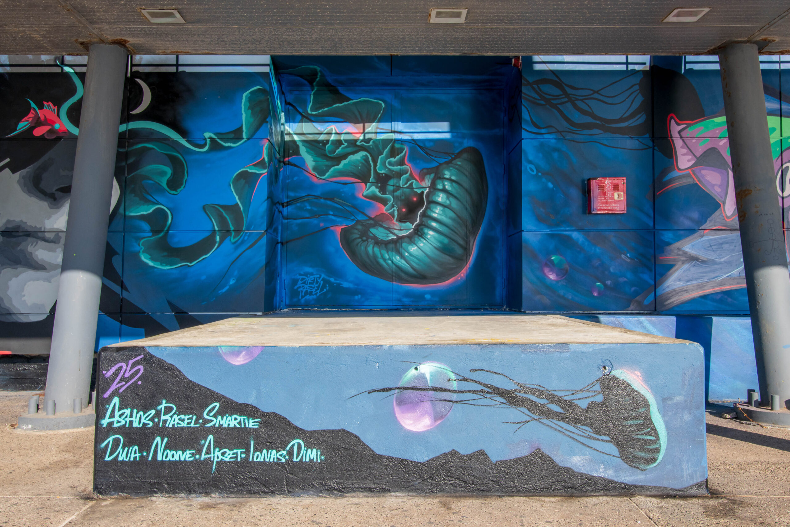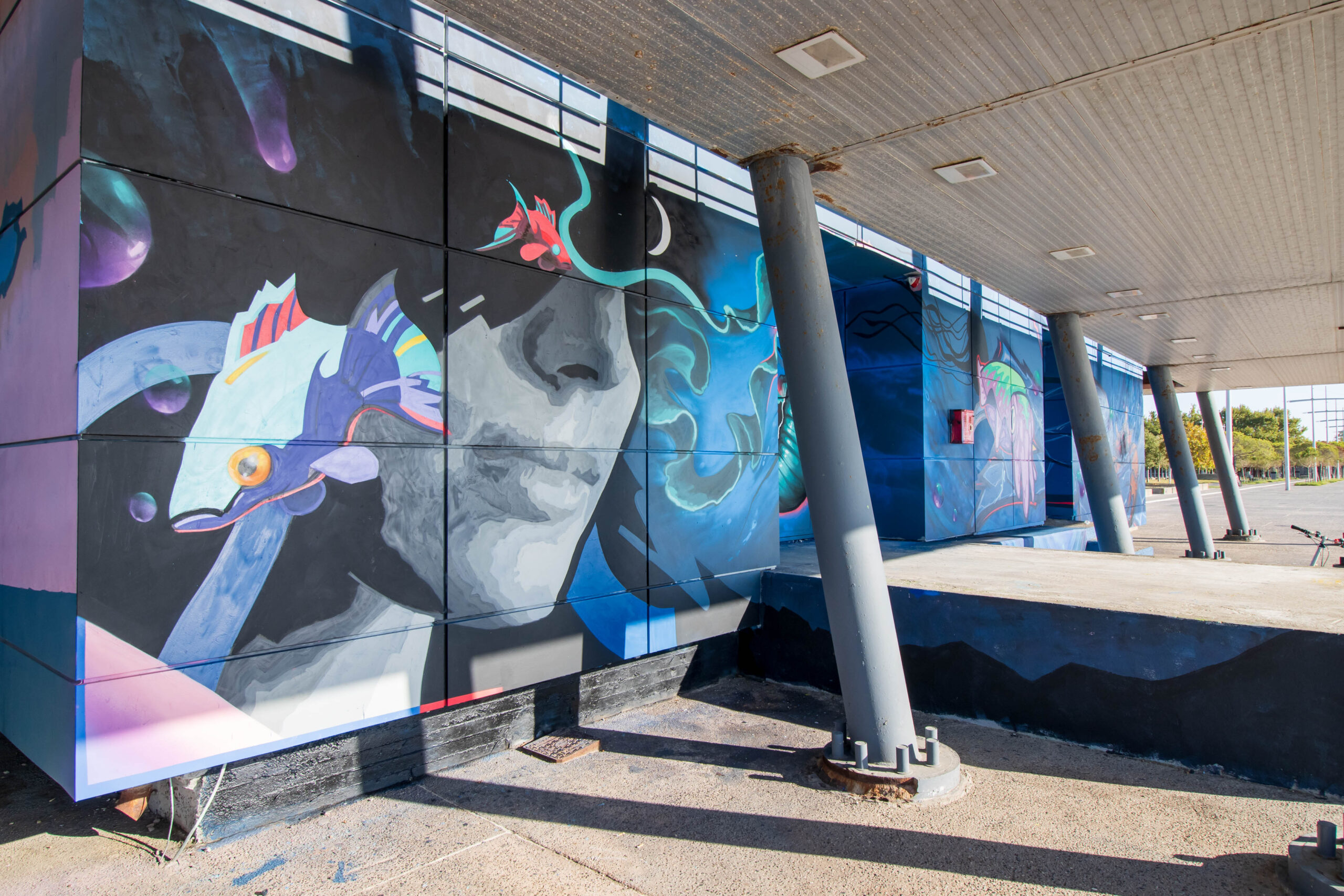 Η τοιχογραφία αντλεί έμπνευση από το στοιχείο του νερού, αποδοσμένο με μια σουρεαλιστική διάθεση. Η σύνθεση απλώνεται στο πλάι, συνδέοντας αρμονικά το υπάρχον σχέδιο με τα κύματα, σαν η επιφάνεια να τελειώνει και να μας καλεί να βουτήξουμε στον βυθό. Στο ανώτερο τμήμα συνεχίζονται επιμέρους στοιχεία, ενώ σε ορισμένα σημεία ξεπροβάλλουν αποχρώσεις που θυμίζουν τα χρώματα του ορίζοντα, δημιουργώντας αίσθηση συνέχειας και απεραντοσύνης. Ο τίτλος “Where the Mind Wanders” εκφράζει τον εσωτερικό κόσμο μιας κοπέλας που ρεμβάζει στην ακροθαλασσιά, οι σκέψεις της κυλούν σαν τα κύματα, παρασέρνοντάς μας σε ένα ταξίδι ανάμεσα στην πραγματικότητα και τη φαντασία.
