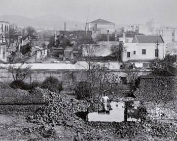 Πίσω από τον ναό διακρίνεται το νοσοκομείο της Ελληνικής Κοινότητας, που είχε κτιστεί στα 1866 με το κληροδότημα του Θεαγένους Χαρίση. Στον κήπο του θα οικοδομηθεί αργότερα η νεοκλασική μητροπολιτική κατοικία. Δεξιά, πίσω από τα γραφεία του προξενείου, το κτίριο με τη βαμμένη σε κάνναβο στέγη στέγαζε δύο οικίες της ελληνικής κοινότητας. Το αγγλικό προξενείο, δηλαδή η οικία Χαρίση, που υπήρχε ήδη το 1841, ήταν μάλλον το κατεστραμμένο κτίριο με τα τοξωτά παράθυρα στη μέση της φωτογραφίας.