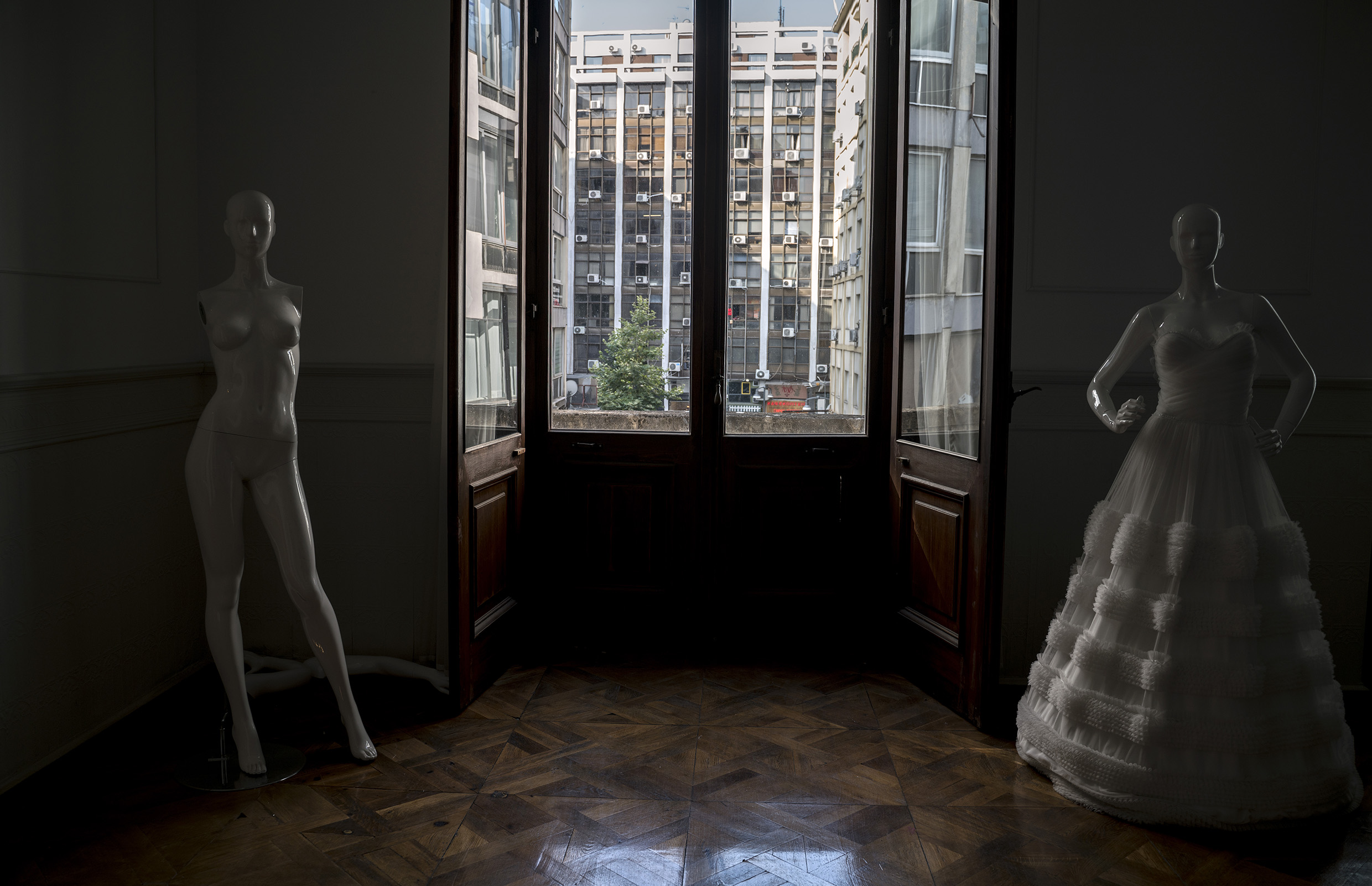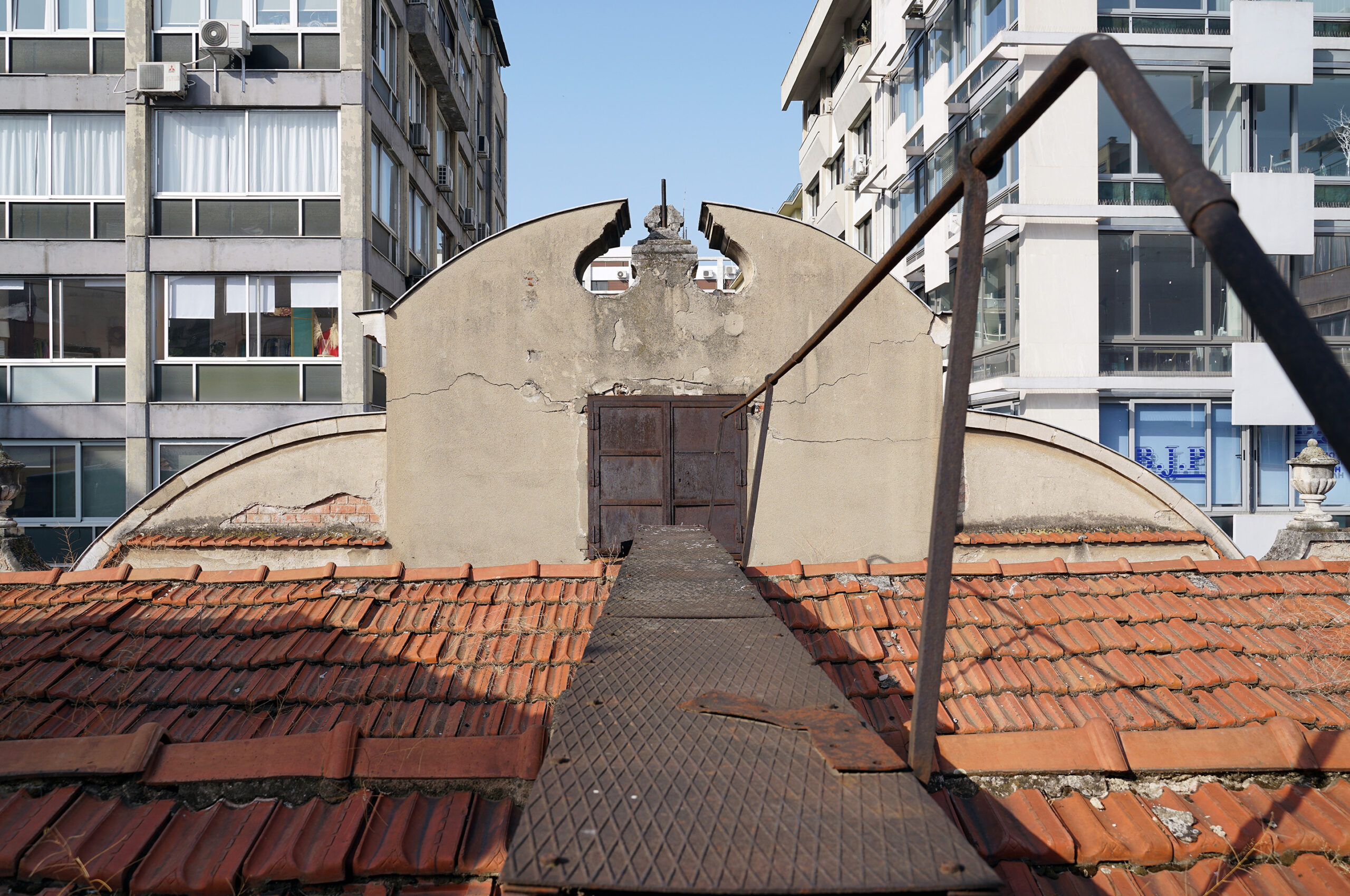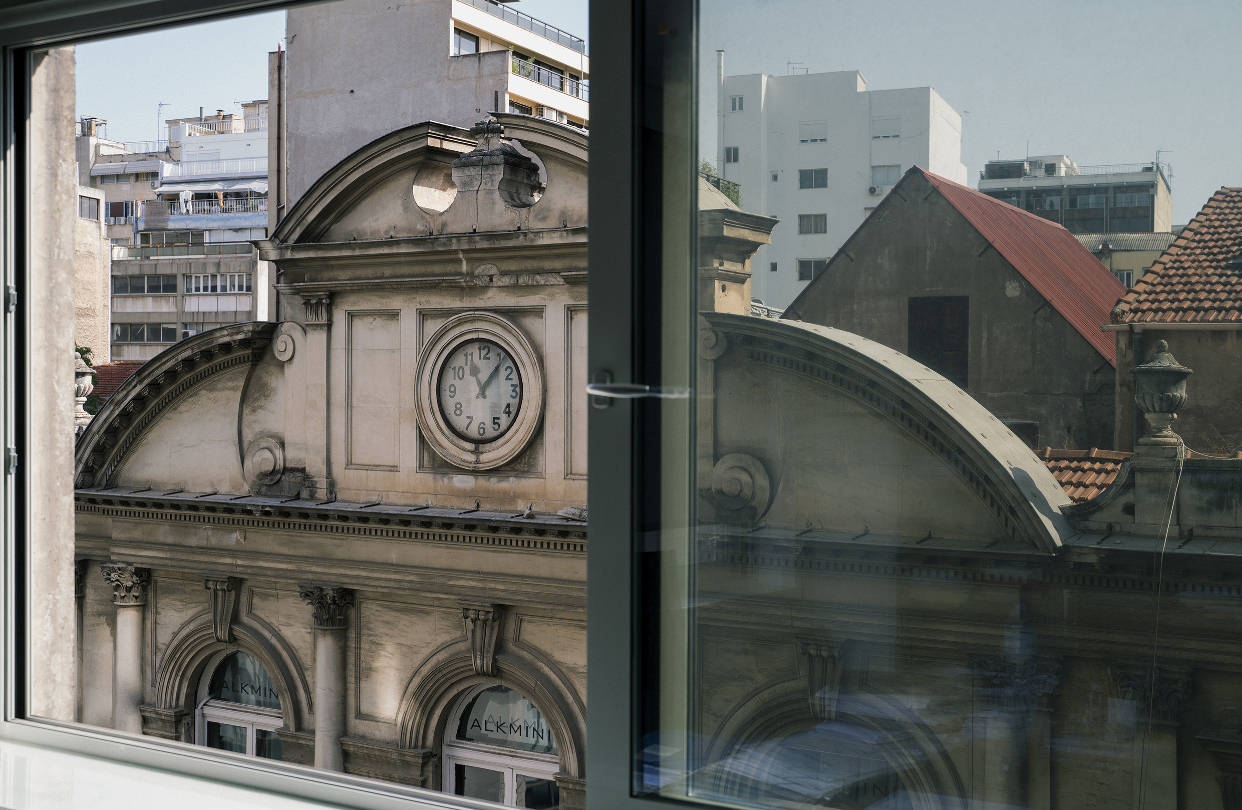 Στη μετώπη του κτηρίου ο Poselli είχε σχεδιάσει ένα ρολόι που έβλεπε την «πλατεία των Τραπεζών», και εδραίωνε με μνημειακό τρόπο τη σημασία του χρόνου στον κατ’ εξοχήν νεωτερικό αιώνα. Πρόκειται για το ρολόι που έπαψε να λειτουργεί στις 11:07 τη νύχτα του μεγάλου σεισμού, στις 20 Ιουνίου 1978, νύχτα που στοίχισε πολλές ζωές και σημάδεψε τη σύγχρονη ιστορία της Θεσσαλονίκης. Σταματημένο για τέσσερις δεκαετίες, το ρολόι μετέχει στο μυστήριο του χρόνου που πλανάται πάνω από την πόλη, στην πυρίκαυστο ζώνη της οποίας η αρχιτεκτονική είναι παντού σχεδόν πυκνή, συμπαγής, σαν να υπάρχει ένας απροσδιόριστος τρόμος του κενού, μια αμηχανία απέναντι στο παρελθόν που συμπιέζεται σε αθέατη στρωματογραφία, αφήνοντας μόνο δοξασμένα σπαράγματα εδώ κι εκεί, τα οποία περιβάλλονται συχνά από τη συνήθη νεοελληνική ακηδία. Οι αθέατες απόψεις που φιλοτεχνεί η Ευδοξία Ράδη από την ταράτσα του κτηρίου της Μαλακοπής, περιεργάζονται προσεκτικά το τοπίο προσκαλώντας τη σκέψη. Παρατηρεί εδώ κανείς τις επιστρώσεις δομημένου χρόνου: θραύσματα μεσοπολεμικής αρχιτεκτονικής ξεδιπλώνονται δίπλα από αγέρωχα γυάλινα κτήρια του ’60 και του ’70 που μας μυούν στην ουτοπική διαφάνεια του χώρου· σόκορες όψεις κτηρίων μαρτυρούν τον μεταπολεμικό εργολαβικό πραγματισμό. Ανακαινισμένοι θόλοι μαρτυρούν αλλού μια απρόσμενη μίξη εποχών και υλικών. Με οπτικό οδηγό τη μικρή σκουριασμένη εξέδρα, η Ράδη μας γνωρίζει το πορτάκι όπου βρίσκεται ο κουρντιζόμενος μηχανισμός του ρολογιού, σφραγισμένος από τον Ιούνιο του 1978. Και ανιχνεύει επίσης το μοναδικό τρόπο που ο χρόνος σκαλίζει τις επιφάνειες αφήνοντας ουλές, φθορές, ρωγμές.